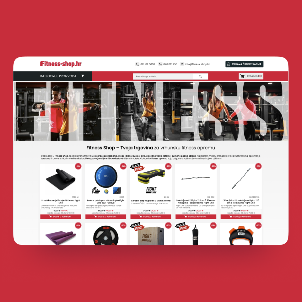 Fitness Shop je specijalizirana trgovina za fitness opremu koja nudi širok asortiman sprava za vježbanje, utega, šipki, bučica, girji, elastičnih traka te tatami i gumenih podnih obloga. Klijent pokriva sve potrebe rekreativaca i profesionalaca — od kućnog treninga do opremanja teretana i sportskih dvorana.